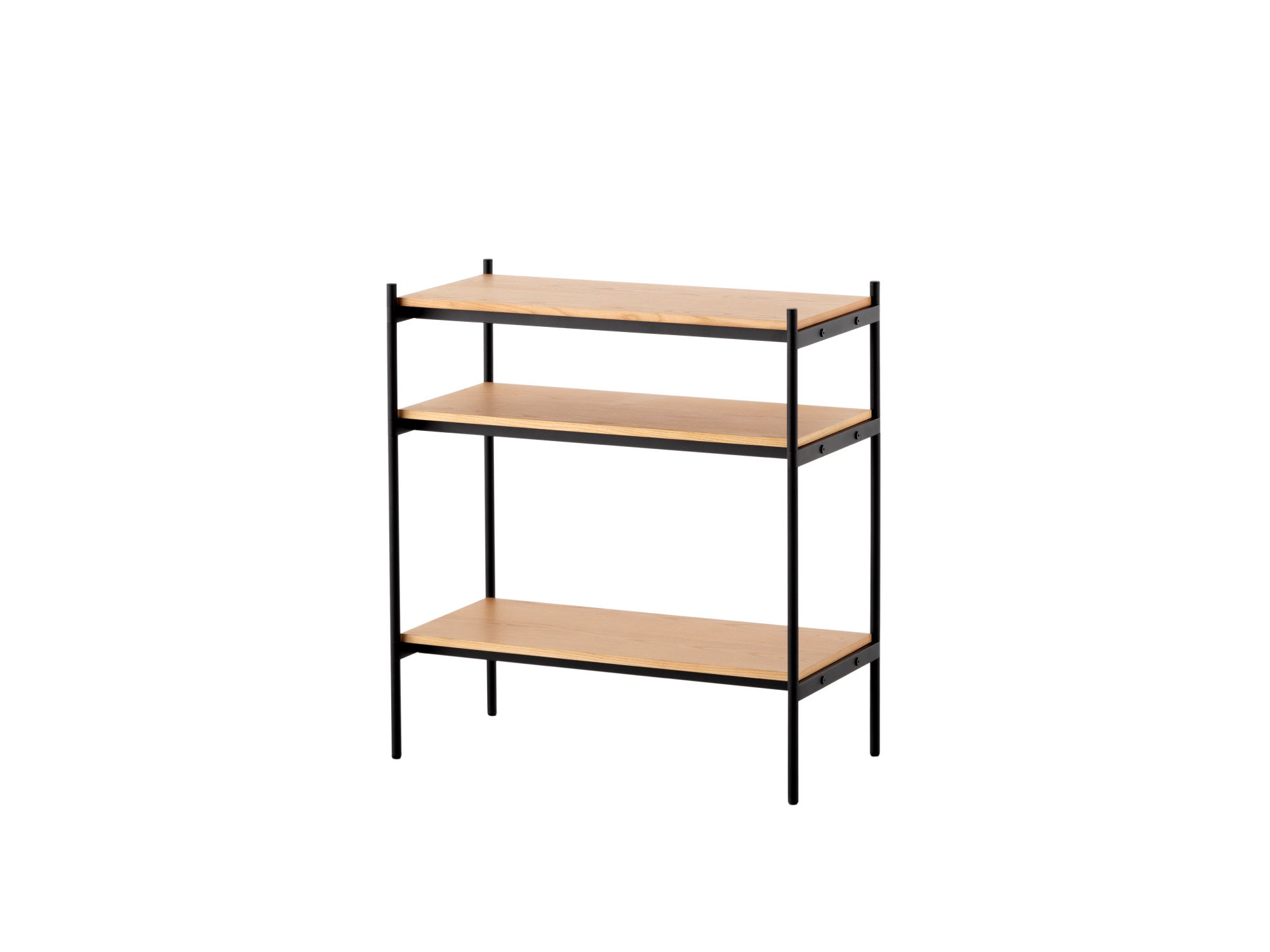 長く使っていただけるよう、傷が目立ちにくい粉体塗装を施した丈夫なスチールを採用。棚板にはナチュラルな風合いを持つ天然木の突板を使用し、耐水性に優れたラッカー塗装を施しました。