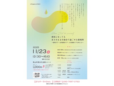令和7年11月23日(日・祝)に、自身もがんサバイバーである三井祐子さんが代表を務める「がんサークルOwls(オウルズ)」が、自分や大切な人のいのちについて考えるきっかけになってほしいと願い「病気になってもありのままの自分で過ごせる居場所 ~緩和ケア・在宅ケア・小児緩和ケアを考える~」を開催します。