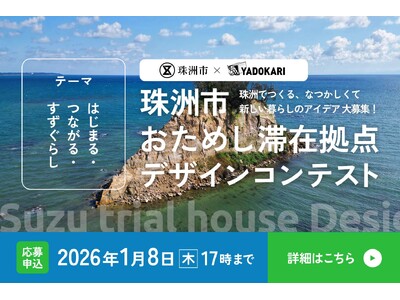 YADOKARI株式会社(本社:神奈川県横浜市/代表取締役 上杉勢太・さわだいっせい、以下「YADOKARI」)は、石川県珠洲市(市長:泉谷満寿裕、以下「珠洲市」)と連携し、「珠洲市おためし滞在拠点デザインコンテスト」(以下「本コンテスト」)を企画・運営いたします。