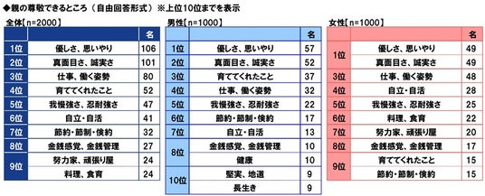 男女別にみると、男女ともに「優しさ、思いやり」が1位となり、男性では2位「真面目さ、誠実さ」、3位「育ててくれたこと」、4位「仕事、働く姿勢」、5位「我慢強さ、忍耐強さ」、女性では「優しさ、思いやり」と同数で「真面目さ、誠実さ」も1位となり、3位「仕事、働く姿勢」、4位「自立・自活」、5位「我慢強さ、忍耐強さ」となりました。また、女性では「料理、食育」が6位に挙がりました。