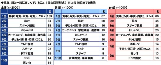 現在、親と一緒に楽しんでいること 1位「食事、グルメ」2位「旅行」3位「スポーツ観戦」