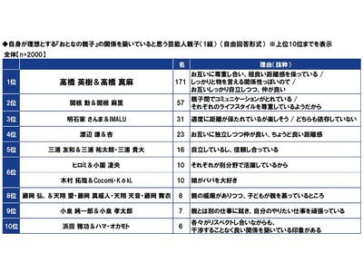 理想の『おとなの親子』だと思う芸能人親子は?「高橋 英樹さん&高橋 真麻さん」「関根 勤さん&関根 麻里さん」が3年連続1位・2位!理由は「高橋 英樹さん&高橋 真麻さん」では「お互いに尊重し合い、程良い距離感を保っている」、「関根 勤さん&関根 麻里さん」では「親子間でコミュニケーションがとれている」など