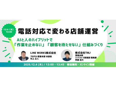 コンタクトセンター・バックオフィス(事務処理センター)の構築・運営を行うセコムグループの株式会社TMJ(本社:東京都新宿区、代表取締役社長:丸山 英毅、以下TMJ)は、LINE WORKS株式会社(本社:東京都渋谷区、代表取締役社長:島岡 岳史)と共催で、ウェビナー「電話対応で変わる店舗運営~AIと人のハイブリッドで『作業を止めない』『顧客を待たせない』仕組みづくり~」を開催します。