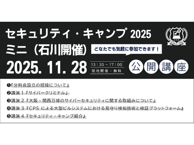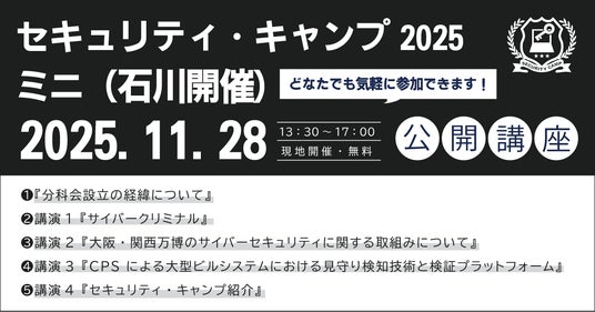 北陸セキュリティフォーラム( ICT 研究開発機能連携推進会議 セキュリティ人材育成分科会)、一般社団法人セキュリティ・キャンプ協議会が主催する「セキュリティ・キャンプ2025ミニ(石川開催)」の公開講座を2025年11月28日(金)に開催いたします。