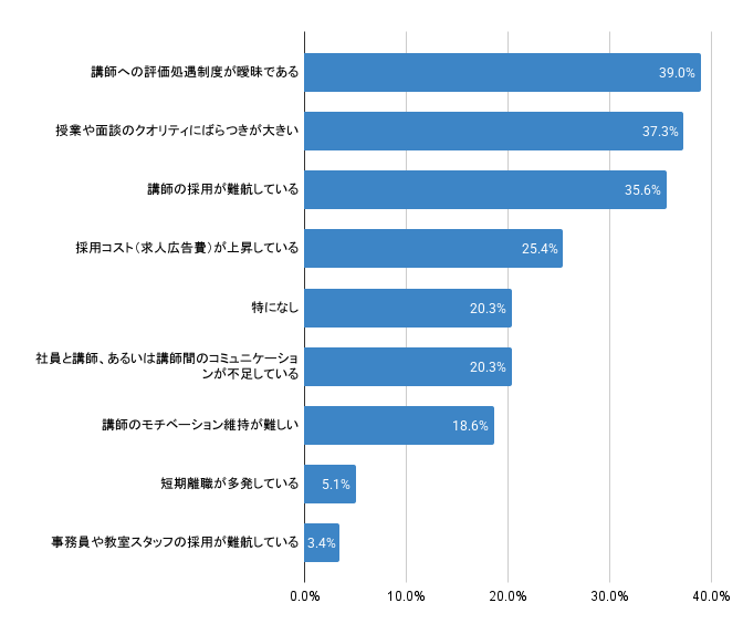人材に関する悩みで最も多かったのが「講師への評価処遇制度が曖昧である」次いで「授業や面談のクオリティにばらつきが大きい」