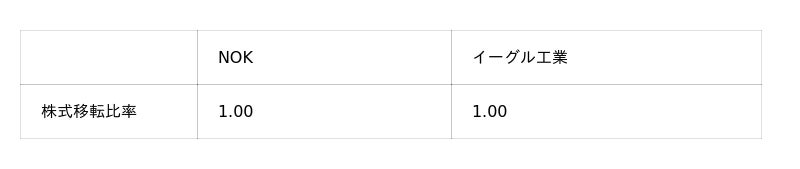 NOKの普通株式1株に対して共同持株会社の普通株式1株を、イーグル工業の普通株式1株に対して共同持株会社の普通株式1株をそれぞれ割当て交付いたします。なお、本株式移転により、両社の株主に交付しなければならない共同持株会社の普通株式の数に1株に満たない端数が生じた場合には、会社法第234条その他関連法令の規定に従い、当該株主に対し1株に満たない端数部分に応じた金額をお支払いいたします。ただし、上記株式移転比率は、算定の基礎となる諸条件に重大な変更が生じた場合には、両社協議の上、変更することがあります。