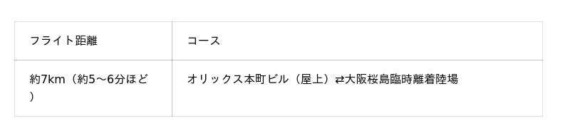 オリックス本町ビル屋上と大阪桜島臨時離着陸場の間の約7kmを、1名8,800円から体験できる移動フライトとして提供し、都市部における空の移動需要を検証します。