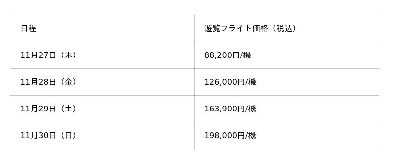 ※飛行実施にあたり、関係当局と調整中のため、商品内容・時間が変更又は中止になる可能性があるため、ご理解の上にてお申し込みくださいませ。
