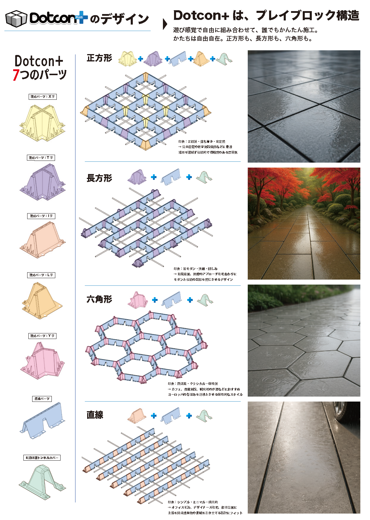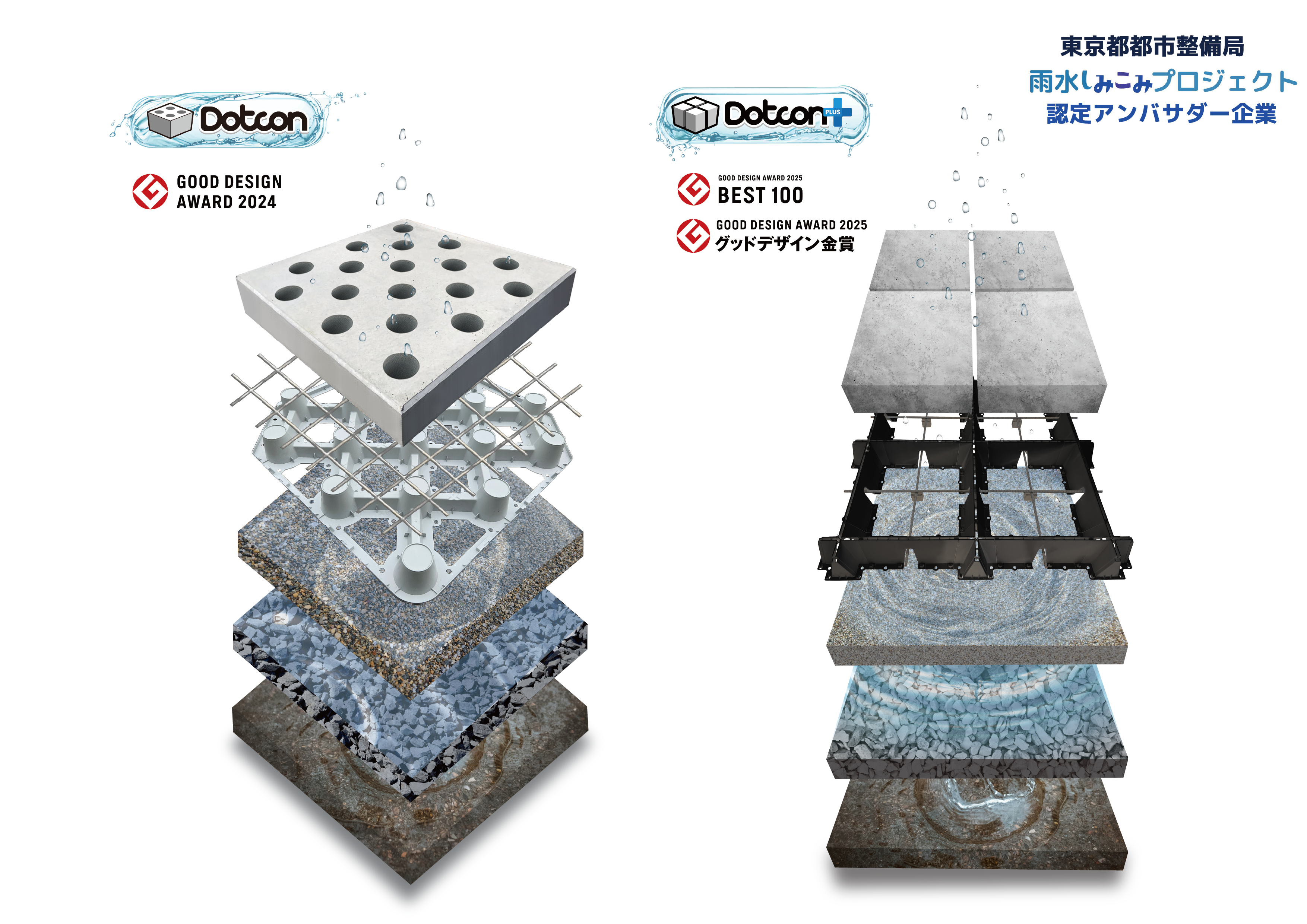 「Dotcon+」は、雨水を地中に浸透・貯留させることで、都市型水害の軽減やヒートアイランド現象の抑制に寄与する