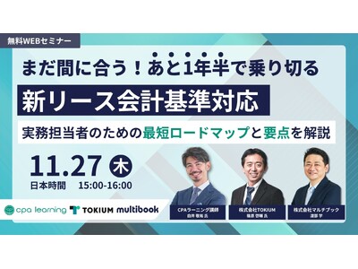 グローバルクラウドERPサービス「multibook(マルチブック)」を提供する株式会社マルチブック(東京都品川区、代表取締役社長:渡部 学)は、CPAエクセレントパートナーズ株式会社(東京都新宿区、代表取締役:国見 健介)、株式会社TOKIUM(本社:東京都中央区、代表取締役:黒崎 賢一)と共同でWebセミナー、