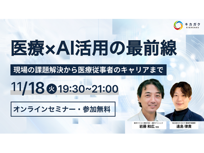 AI・機械学習領域の教育でDX人材育成を支援する株式会社キカガク(本社:東京都渋谷区、代表取締役:大崎 将寛)は、東京ネクスト南砂内科・透析クリニック 医師の岩藤 和広氏と共同で、無料オンラインセミナー「医療×AI活用の最前線 ~現場の課題解決から 医療従事者のキャリアまで~」を2025年11月18日(火)に開催いたします。