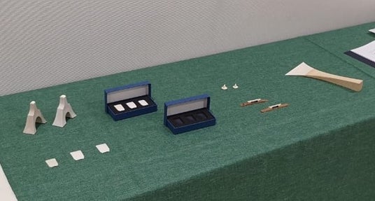 象牙代替素材で作られた和楽器アイテムの展示