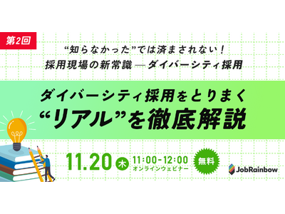 株式会社JobRainbow(本社:東京都千代田区、代表取締役:星賢人)は、2025年11月20日(木)11:00-12:00にてオンラインセミナー「 “知らなかった”では済まされない採用現場の新常識ーダイバーシティ採用 ~ダイバーシティ採用を取り巻く“リアル”を徹底解説~」を再開催いたします。