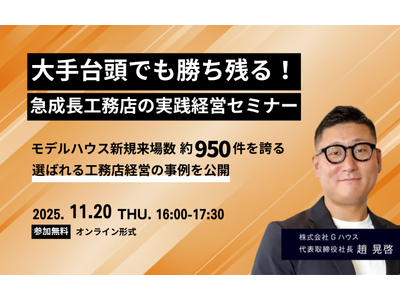 株式会社Gハウス(本社:大阪府大阪市旭区、代表取締役社長:趙晃啓)は、住宅業界のコンサルティングを行う株式会社SUMUS(スムーズ)との共催による特別オンラインセミナーを2025年11月20日(木)に開催いたします。本セミナーでは、著しい成長を遂げてきたGハウスの経営ノウハウを公開し、厳しい市場環境下を勝ち抜くための経営戦略・施策についても具体的に解説いたします。