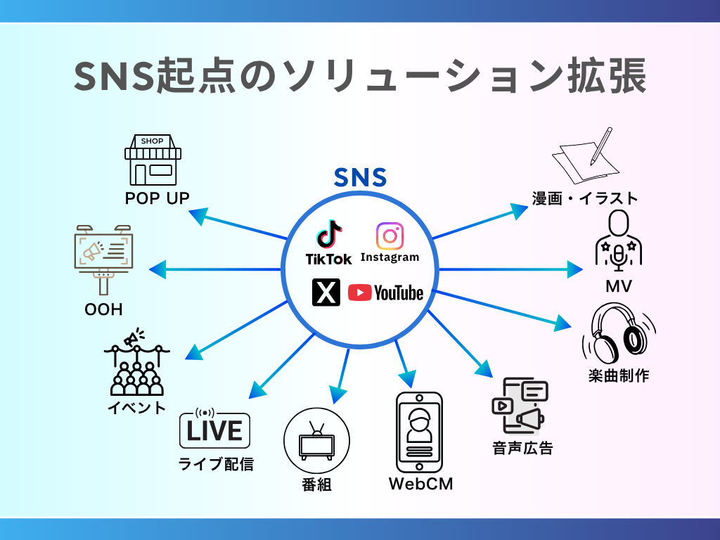 オフラインイベントやライブ配信、番組、WebCM、音声広告、楽曲制作、MV、漫画・イラスト、ポップアップストア、OOH施策など、SNSを起点にしたクリエイターの世界観を多様な形で社会に届ける取り組みを推進。