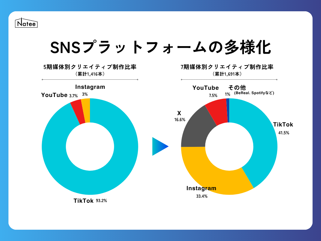 直近では、新たにBeReal.やSpotifyといった媒体にも拡張し、SNS全体を横断するマーケティングでブランドの事業成長を支援してきました。具体的に、2年前の5期に制作したクリエイティブの媒体割合が【TikTok:93%/YouTube:4%/Instagram:3%】だったのに対し、7期では【TikTok:42%/Instagram:33%/X:17%/YouTube:7%/その他:1%】と多様化し、SNSを横断して成果を創出できる体制を確立しました。