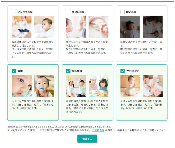 「センシティブ写真チェック機能」が追加されることで、AIが不適切と判断した写真は安全上の理由から自動で『販売対象外』として分類され、連絡帳やドキュメンテーションなど他のサービスからは参照・利用ができなくなります。