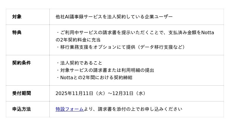 本キャンペーンでは、「Notta」以外のAI議事録サービスをご利用中の法人ユーザーを対象に、他社サービスに支払い済み金額をNottaの2年利用権に充当できる特典を提供いたします。