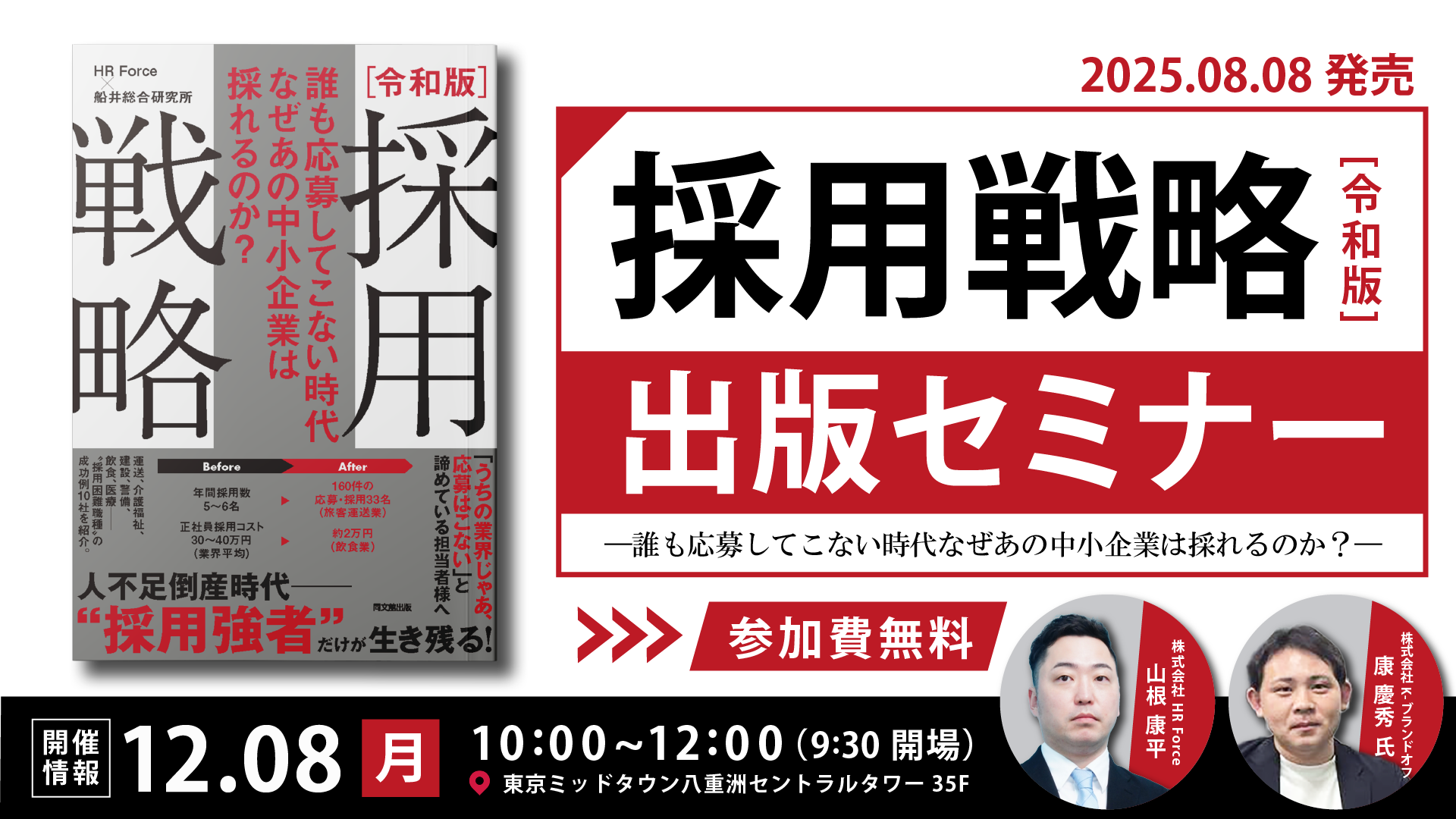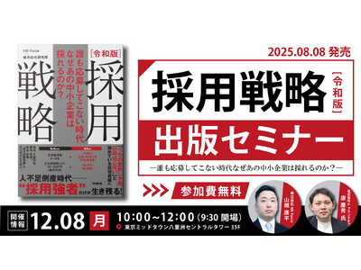 株式会社HR Force(本社:東京都中央区、代表取締役社長:村田 泰子、以下HR Force)は、2025年8月8日(金)に発売した『誰も応募してこない時代 なぜあの中小企業は採れるのか? 令和版 採用戦略』の出版を記念して、2025年12月8日(月)に「採用強者企業」への転換を実現するための実践的戦略セミナーを開催いたします。