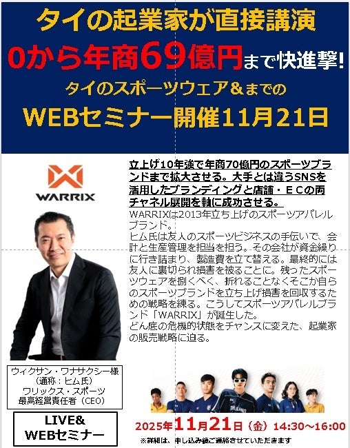さらに、同社のCEOであるヒム氏に直接講演をいただき、現地バンコクから同時通訳にてLIVE・WEBセミナーになりますので、他社では聞くことができない東南アジア・タイの現地のビジネス状況を知る内容になっております。開催は2025年11月21日14:30~16:00に開催を予定しています。ぜひ、東南アジア・タイ、EC事業を知りたい方はぜひ、ご参加ください。