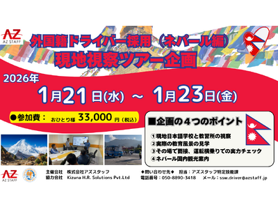 ネパールで外国籍ドライバーの教育事業を手掛けるアズスタッフが現地の日本語学校や教習所などの教育機関の視察、面接が可能なツアーを開催することを策定した。