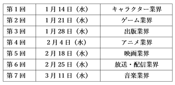 ジャンルを越えたコンテンツビジネスを生み出すために、キャラクター、ゲーム、出版、アニメ、映画、放送・配信、音楽の全7ジャンルについて、最新の市場分析や収益構造、展望、課題等とともに、各社の展開事例について1日(3時間)で学びます。