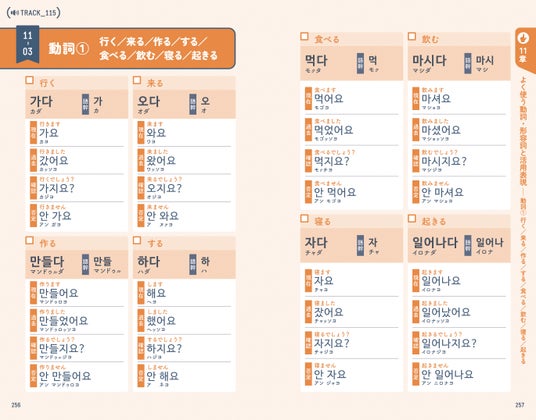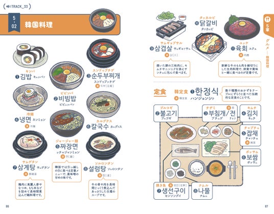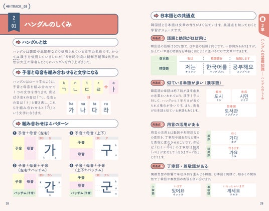 知っておきたいハングルの読み方、韓国語の基本をぎゅっとまとめて解説しました。基本のあいさつ表現やお願いのフレーズのほか、よく使われるひとことパンマル(ため口)表現も収録。さらに、重要な動詞と形容詞は、活用と例文も紹介しているので、初学者にもおすすめです。