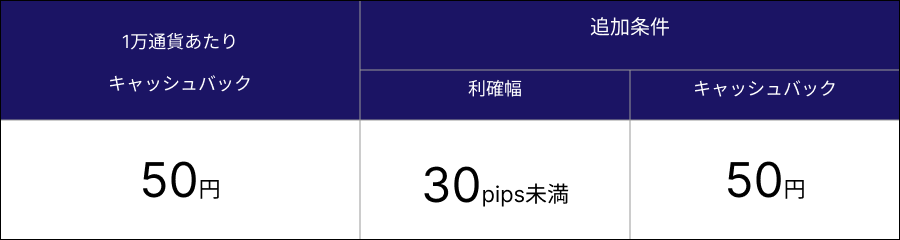 さらに、決済の利確幅が指定の範囲の決済取引には、追加で50円をキャッシュバックいたします。