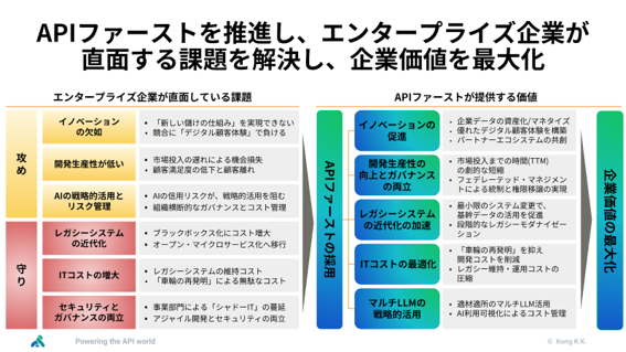日本企業のデジタルトランスフォーメーションは進展していますが、依然としてレガシーシステムやサイロ化、セキュリティ・ガバナンスなどの課題を抱えています。急速に普及する生成AIやAIエージェントを安全かつ効果的に活用するためには、APIを戦略資産とする「APIファースト」の実践が欠かせません。まさに