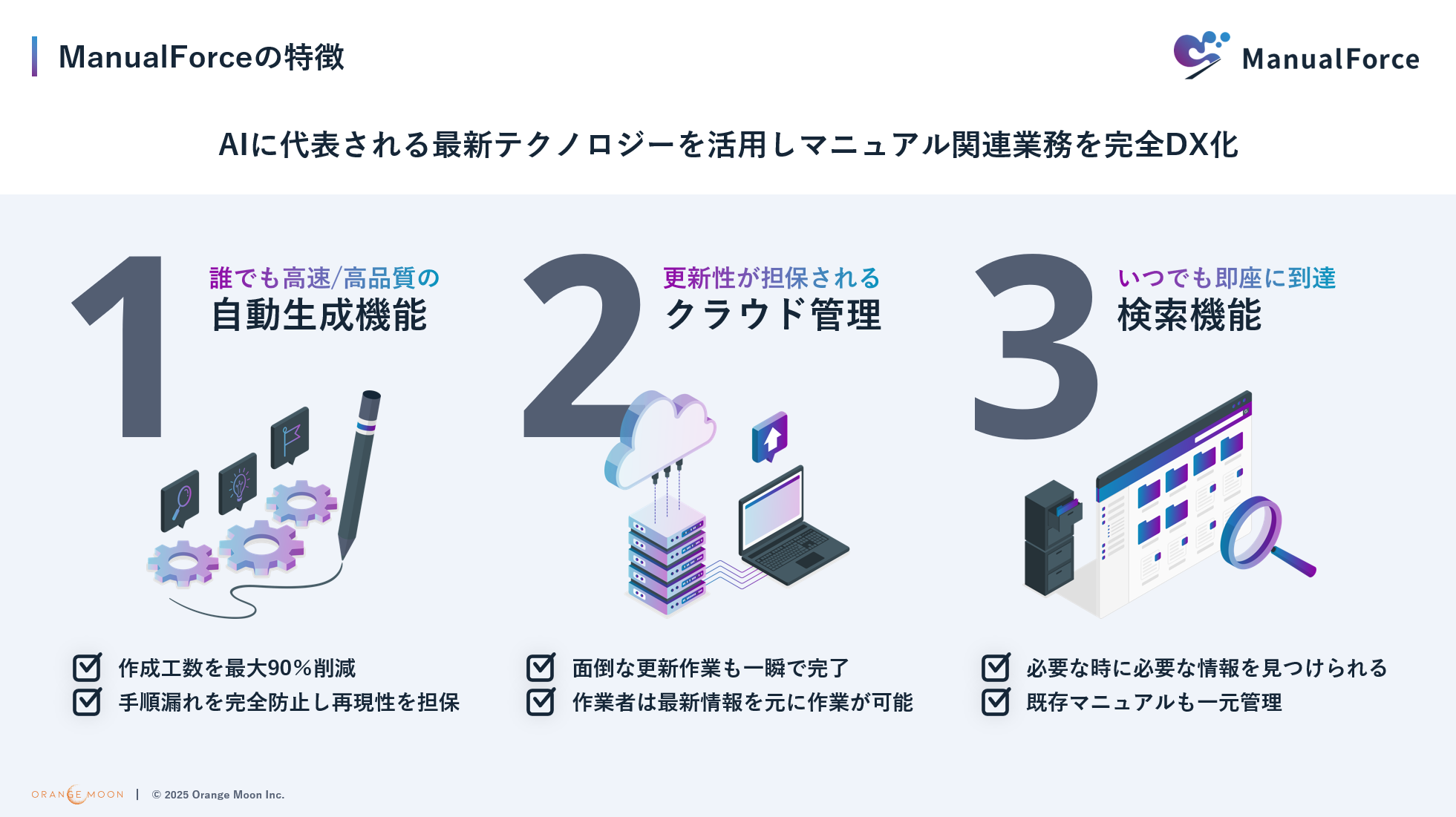 Orange Moon株式会社(本社:東京都港区、代表取締役 サチンチョードリー/増山慶之)は、PLiBOT株式会社(本社:東京都葛飾区、代表取締役 佐藤 正明)が、AIマニュアル自動作成・共有サービス「ManualForce」を導入したことを発表します。