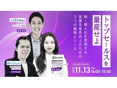 株式会社immedio(本社:東京都渋谷区、代表取締役:浜田 英揮)は、2025年11月13日(木)に開催されるウェビナー「トップセールスを量産せよ!脱・属人化を実現する営業生産性向上3つの戦略とツール」に、マーケティングの小牧が登壇することをお知らせします。