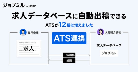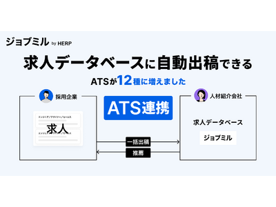 株式会社HERP(本社:東京都品川区、代表取締役:庄田一郎)は、人材紹介システム『ジョブミル』の求人データベースへの求人掲載に対応できる採用管理システム(ATS)を12種類に拡大したことをお知らせします。採用企業は、利用中のATSに登録した求人を自動で『ジョブミル』に掲載でき、取引先以外の人材紹介会社に対し、手間なく推薦を依頼できます。