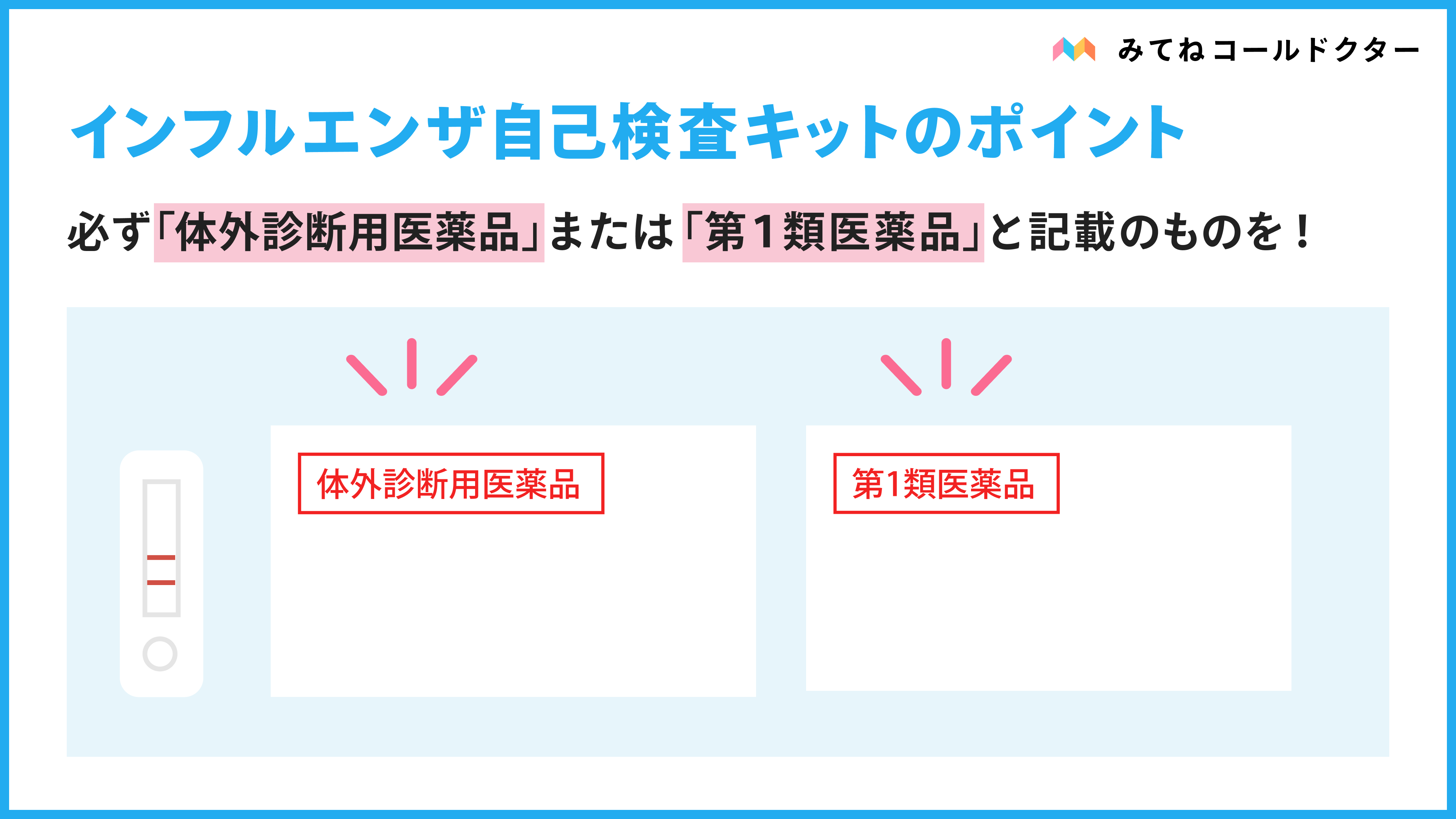自己検査キットは「体外診断用医薬品」または「第1類医薬品」を選びます。国に承認された検査キットとオンライン診療を有効活用すれば、確実な検査の実施と、医師による診察が受けられます。