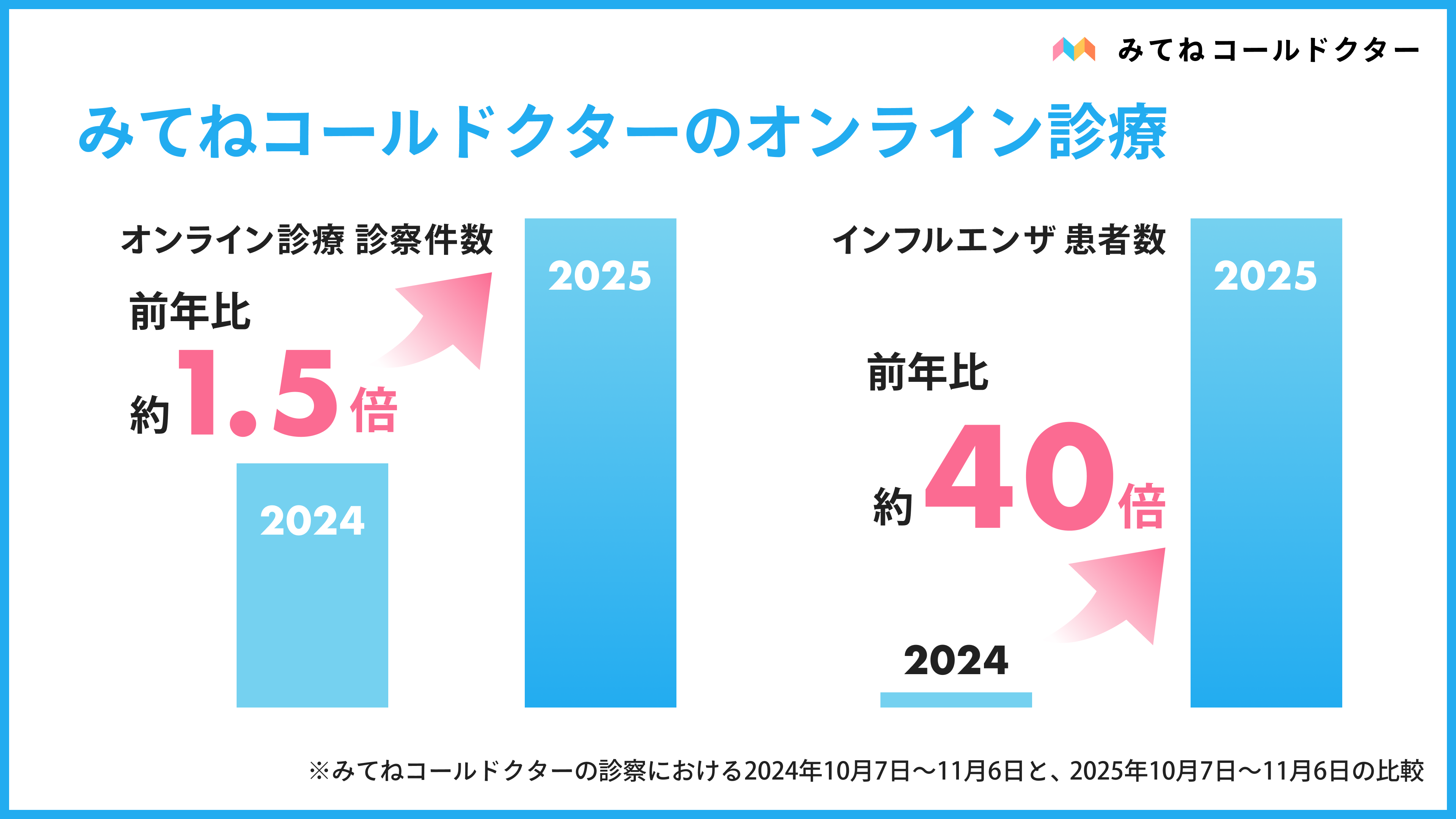 オンライン診療アプリ「みてねコールドクター」では、10月~11月のオンライン診療の患者数が前年比の約1.5倍に増加。インフルエンザの患者数は前年比約40倍となっています。