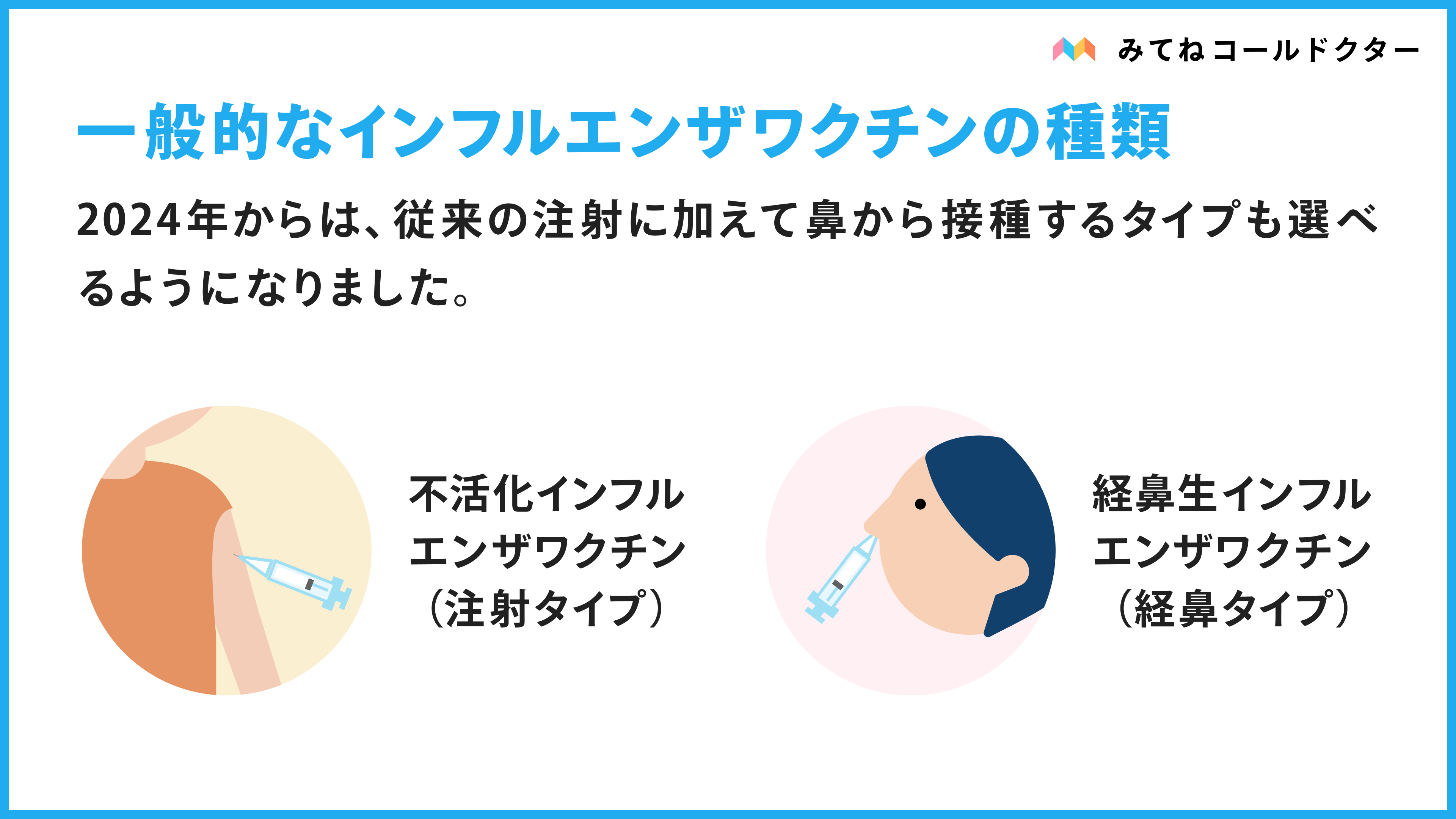 インフルエンザワクチンは、従来の注射タイプのワクチンの他に、2024年から経鼻タイプ(鼻にスプレーをするタイプ)も登場しました