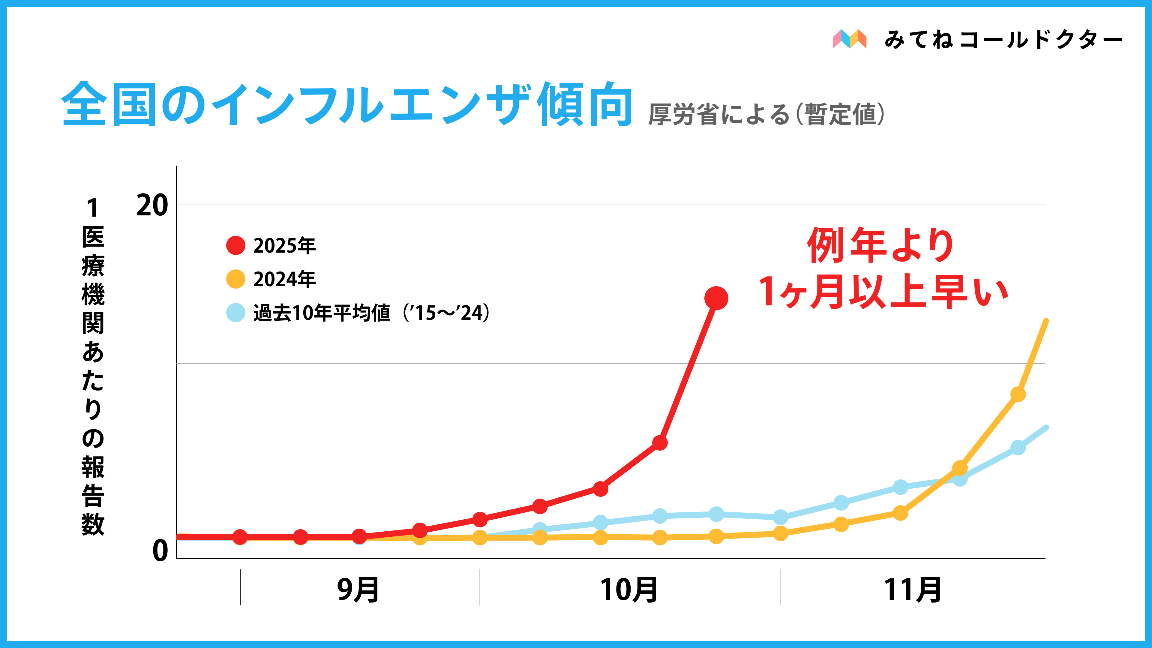 国立健康危機管理研究機構が発表するデータによると、2025年10月、例年より1ヶ月以上早いタイミングで、インフルエンザの全国的な流行入りが発表されました。