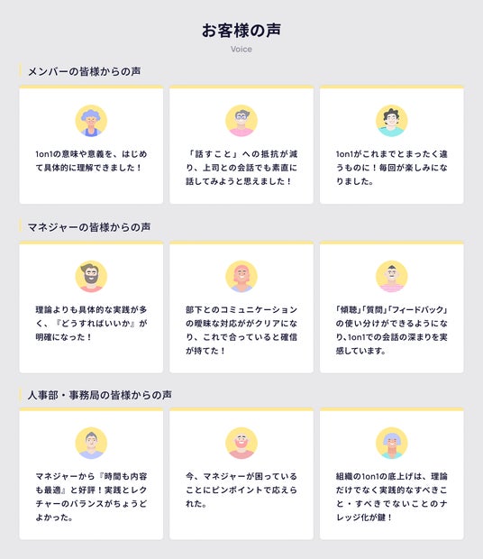 日常の1on1を通じて信頼と行動変容を生み出す「対話の型」を現場に定着させることを目的としており、メンバー・マネジャー・経営層それぞれの役割に合わせて構成されています。