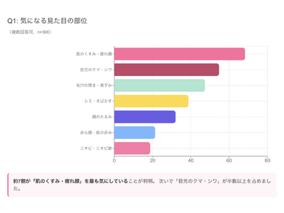 結果: 1位: 肌のくすみ・疲れ顔(68.3%) 2位: 目元のクマ・シワ(54.7%) 3位: 毛穴の開き・黒ずみ(47.3%) 4位: シミ・そばかす(38.7%) 5位: 顔のたるみ(32.0%) 6位: 赤ら顔・肌の赤み(21.3%) 7位: ニキビ・ニキビ跡(18.7%)
