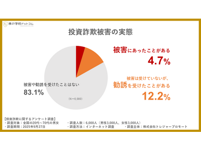 オンライン株式スクール「株の学校ドットコム」(運営会社:株式会社トレジャープロモート、東京都千代田区、代表取締役社長:瀬川 丈)では、例年、投資詐欺被害の実態調査を行っています。それによると、実際に投資詐欺の被害にあったことがあると回答した人は4.7%にのぼり、年々増加していることがわかります。