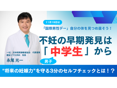 「国際男性デー」は、ジェンダー平等や男女間の相互理解を促進する日でもあります。不妊治療というと“女性が取り組むもの”という固定観念がいまだ根強くありますが、実際には男性側の原因も半数を占めています。「男性自身が中学生のうちから体の変化に関心を持ち、セルフチェックを行う習慣を広めていくことが、真の男女平等につながる第一歩だと、私たちは考えています」(永尾光一医師)。