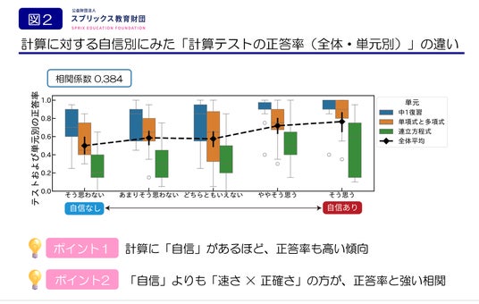 「テストの正答率」や「解答速度」などの客観的な計算力指標が高いほど、生徒の主観的な自信も高まりやすい、と考えられます。