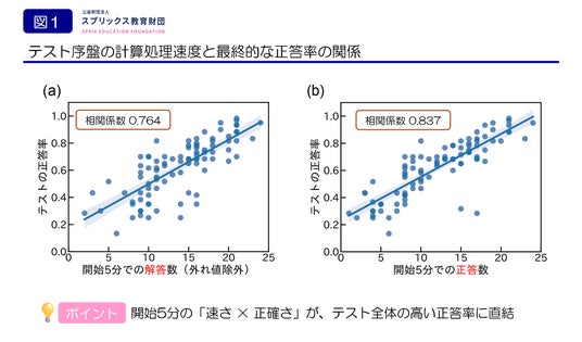 テスト開始直後5分間での正答数(以降、序盤の正答速度と記載)(横軸)とテスト全体の正答率(縦軸)の関係を示したのが図1(b)です。図1(b)では相関係数がR=0.837と非常に高く、テスト開始直後に速いだけでなく、