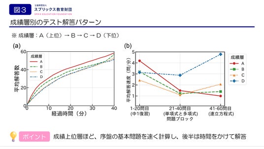 成績上位のグループは序盤で解答が速く、終盤は慎重になる「ペース配分戦略」を取りました。一方、成績が下位のグループほど終盤に解答速度が不自然に急上昇する「駆け込み解答」がみられるなど対照的な解答パターンを示しました。
