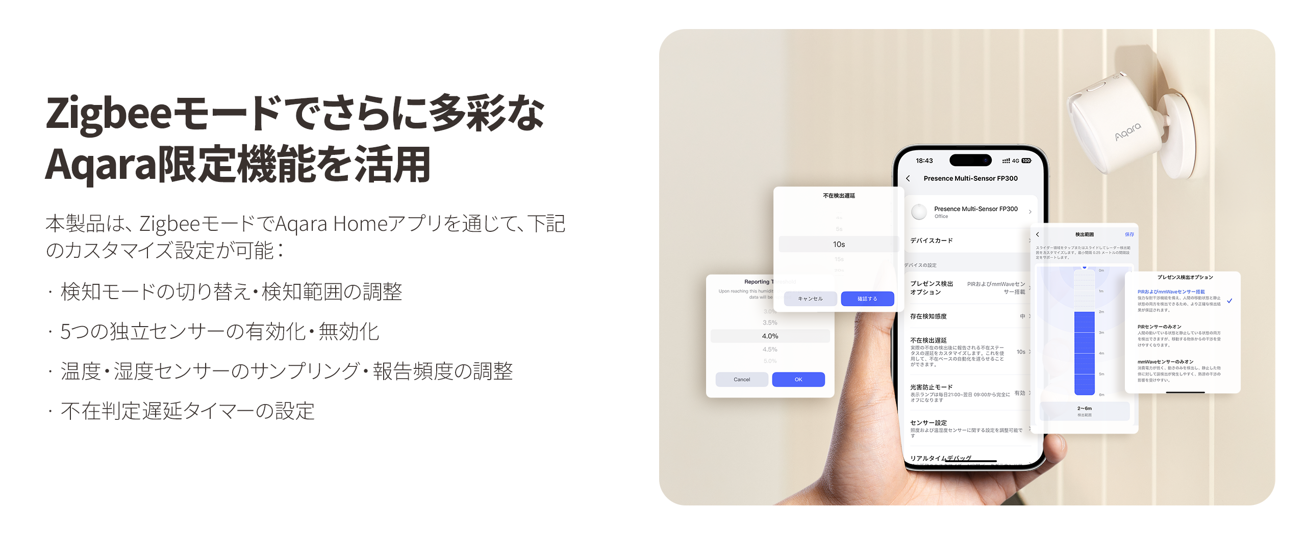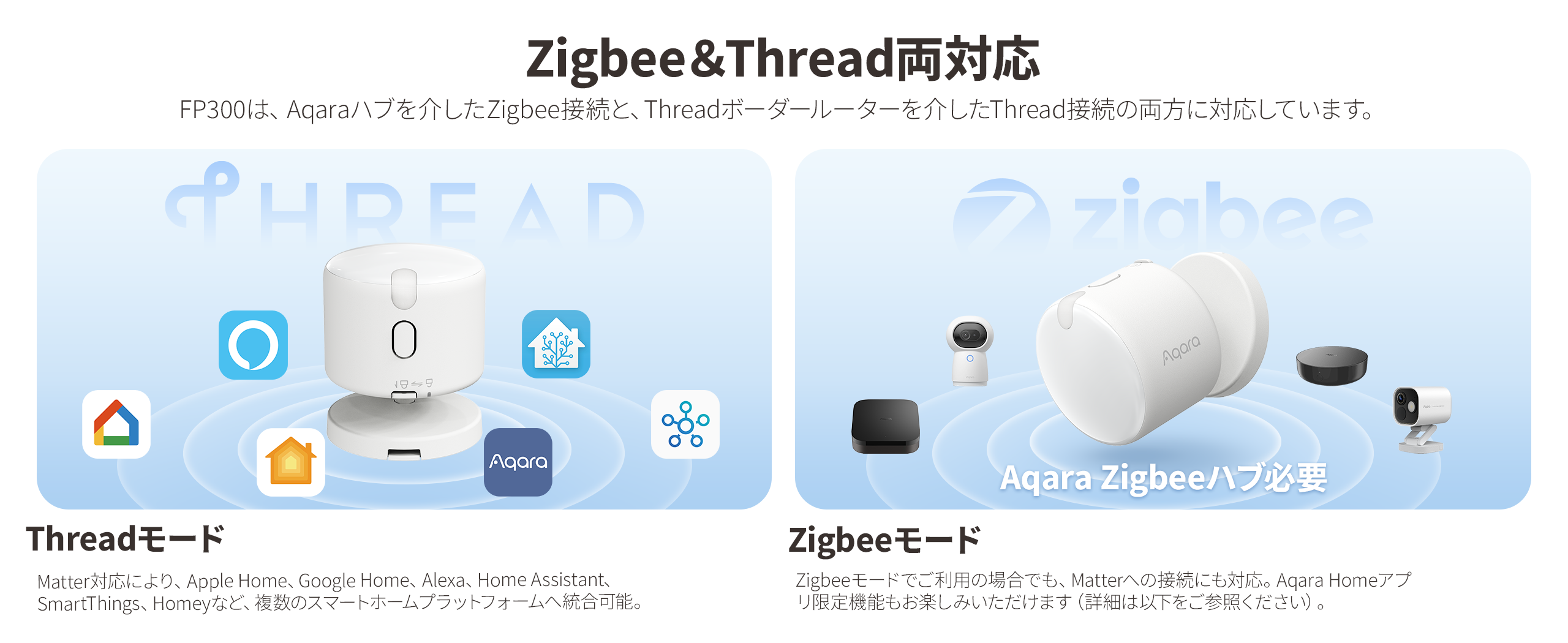 FP300はMatterにネイティブ対応しているため、AqaraハブがなくてもApple HomeやAmazon Alexaなどに直接接続することが可能に。面倒な設定や追加機器なしですぐに使い始められます。さらに同時にThreadにも対応しているため、安定性が高くデバイスの応答速度もスピーディー。照明やセンサーの反応が遅れることなく、ストレスのないスマートホーム体験を実現します。また、AqaraのZigbeeハブと連携してZigbeeモードに切り替えることで、在室検知の範囲や不在タイマー、特定センサーの有効・無効設定などAqara Homeアプリ限定の高度な機能も利用可能です。