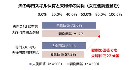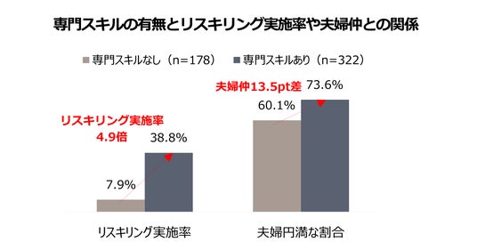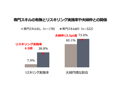 専門スキルの保有状況とリスキリングの取り組み状況を調べてみると、専門スキル保有者の38.8%がリスキリングに取り組んでいる一方で、専門スキルを持たない層ではわずか7.9%にとどまり、差異は30.9ポイント(約4.9倍)と大きな開きがあることがわかりました。さらに、専門スキルと生成AI活用状況について調べてみると、専門スキル保有者の37.9%が生成AIを仕事で活用している一方で、専門スキルを持たない層では15.7%(22.2ポイント差/約2.4倍)にとどまる結果となりました。こうした傾向は夫婦仲にも同様に現れ、専門スキルを保有していると回答した方では夫婦円満と回答した方が73.6%だった一方で、スキルなしと回答した方では60.1%と13.5ポイントも差が現れました。
