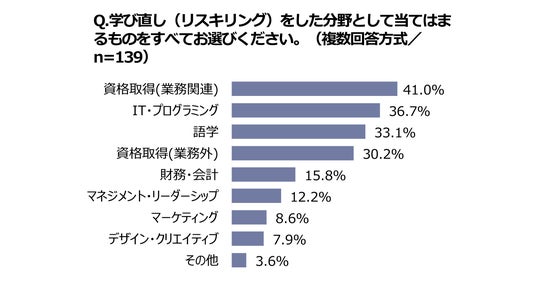 最も多いのは「取り組んだことがない」という回答で61.4%と半数以上にのぼりました。実際に取り組んでいる分野としては、「資格取得(業務関連)」が最も多い41%となりました。