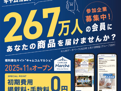 「働く」に関する社会課題をビジネスで解決するキャムコムグループで人材派遣、人材紹介、BPO事業を担う株式会社綜合キャリアオプション(以下綜合キャリアオプション、本社:東京都港区、代表取締役:神保紀秀・大泉高太 )は、2025年11月20日に福利厚生サイト「キャムコムマルシェ」をオープンします。現在、初期費用・掲載費・手数料すべて無料で商品を掲載できる企業を募集しています。