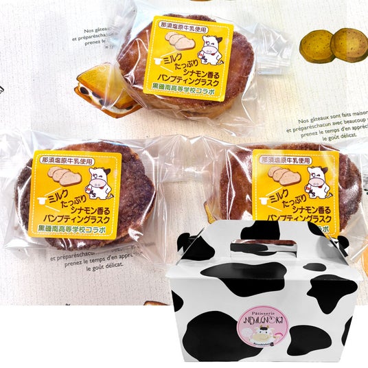 地元民が愛するハレの日の定番洋菓子店ねむの樹が、那須塩原市主催の「栃木県内高校生料理コンテスト」で優良賞を受賞した栃木県立黒磯南高等学校の生徒の作品とコラボし、那須塩原市産牛乳を100%使用したラスク。かわいらしい白黒の牛柄をモチーフにした外箱にも目を惹きます。