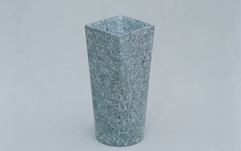 自他ともに認める大の酒好きな成田さんがオーダーしたのは、ゆっくりとお酒を楽しむため、片手で持ちあげられないくらい重い酒器。高級石材である庵治石を使った酒器は、成田さんを象徴する円と四角のメガネに由来する、底面が丸・天面が四角になったユニークなデザインに。