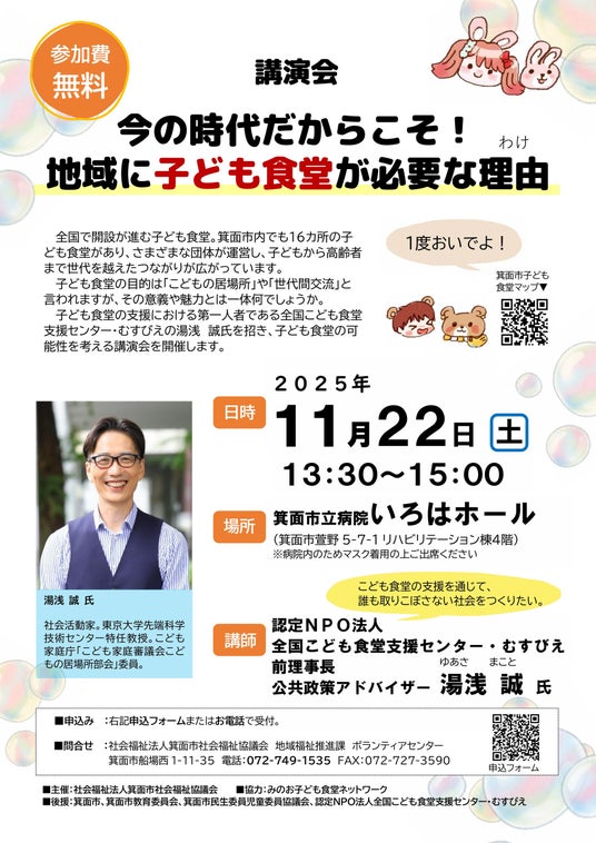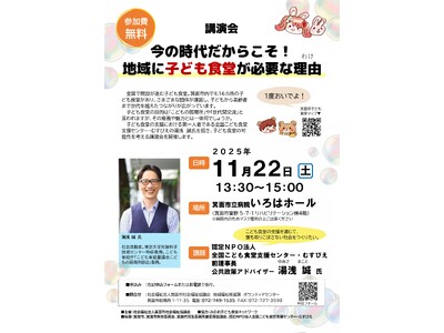 2025年11月22日(土)、社会福祉法人箕面市社会福祉協議会(所在地:箕面市船場西1-11-35)は、地域における子ども食堂の意義や魅力、そしてこれからの可能性について考える講演会を開催します。